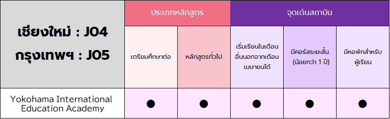 มีคลาสเรียนเตรียมสอบ EJU สำหรับผู้ที่ต้องการเข้าศึกษาต่อในระดับมหาวิทยาลัย คลาสเรียนเตรียมสอบ JLPT สำหรับผู้ที่ต้องการเข้าศึกษาในวิทยาลัยวิชาชีพ และคลาสเรียนภาษาญี่ปุ่นเชิงธุรกิจสำหรับผู้ที่ต้องการทำงาน ทางสถาบันมีหลักสูตรภาษาญี่ปุ่นที่เหมาะสำหรับสำหรับความต้องการต่าง ๆ