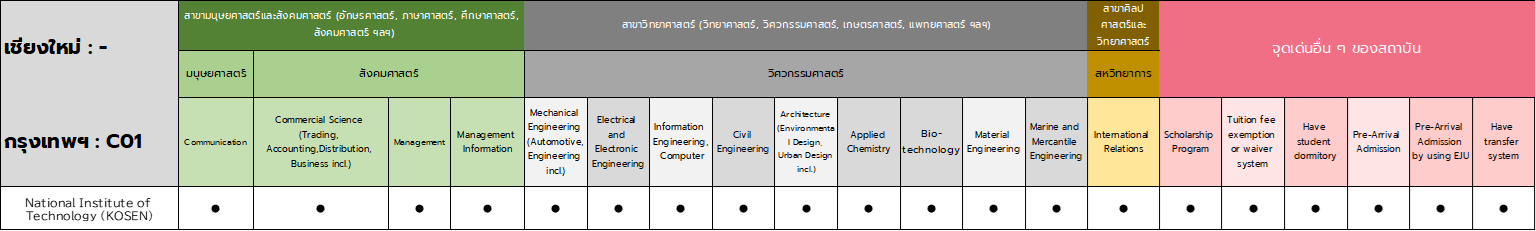 วิทยาลัยเทคนิค KOSEN เป็นสถาบันที่สอนด้านเทคโนโลยี มีนักศึกษาที่จบจากที่นี่มากกว่า 80% ที่ตัดสินใจเรียนต่อในระดับปริญญาตรี (โอนหน่วยกิตเข้าปี 3) และ หลักสูตรวิชาชีพชั้นสูง เรามุ่งมั่นในการจัดการเรียนการสอนอย่างใส่ใจ โดยให้ความสำคัญกับนักเรียนแต่ละคนอย่างแท้จริง